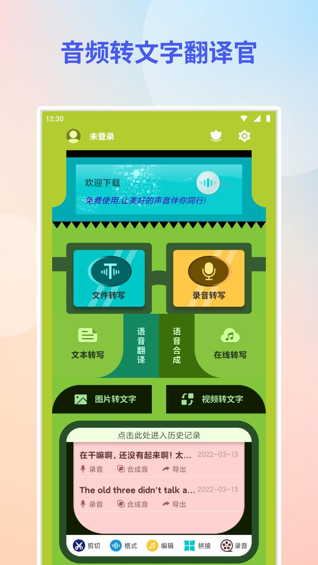 是一款集语音转文字,音频文件转文字,视频文件转文字,文字翻译,文字合成语音,文字转文本,连机翻译,音频剪切,音频转格式,视频提取音频等多种功能于一体的专业软件;华军软件园提供音频转文字翻译官-音频文字识别app官方版下载地址,有需要的用户可免费下载使用!