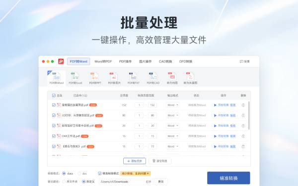 格式转换:支持PDF与Word、Excel、PPT、图片、TXT、CAD、OFD等格式互转,批量转换提升效率,保留原格式。