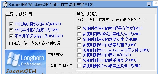 2楼 华军网友 2013-10-09 22:22:38WindowsXP减肥大师界面设计很容易上手,功能很丰富,本人极力推荐!
