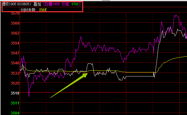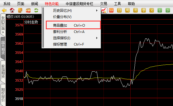 2)进入分时走势之后,点击菜单栏上的“特色功能”并点击“商品叠加”