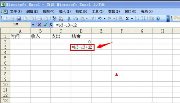 3、然后我们定义B1为“收入”、C1为“支出”、D1为“结余”,然后我们就可以定义函数了,这个比较有意思,也很重要。我们点中D2格,然后在D2键值内容里填入“=b2-c2”