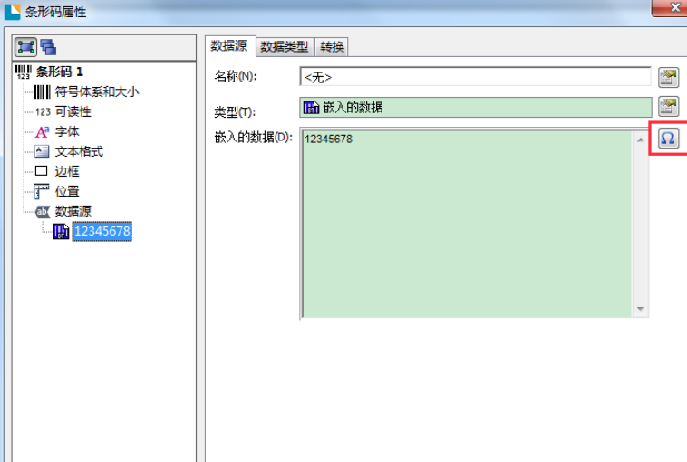 1、双击BarTender桌面快捷方式,打开软件后创建一个条形码,然后双击条形码,打开属性窗口,点击顶部的第一个选项卡,在左侧的窗口中点击数据源选项,在右侧界面中点击嵌入的数据源右侧的【插入符号或特殊字符】按钮。