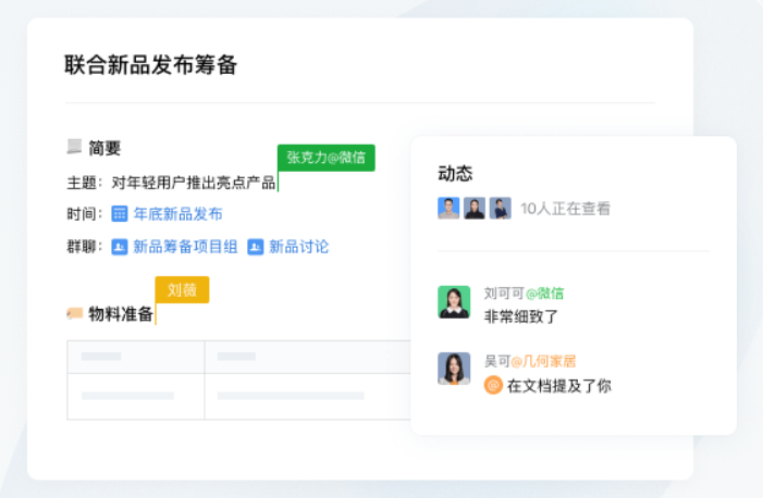 可个人创作或者与同事共同编辑的文档和表格,企业和创作者可设置文档的内外部访问权限、文档水印。文档修改实时更新,同事间共享不用多次传输。