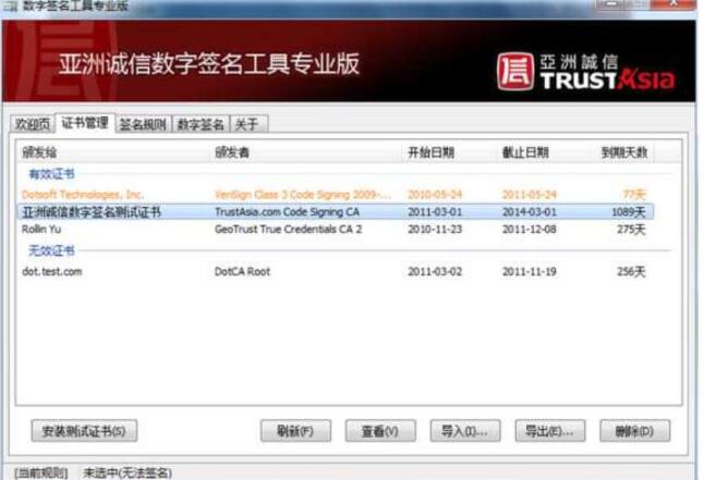 4、测试证书安装成功后,会在“有效证书”里看到“亚洲诚信数字签名测试证书”