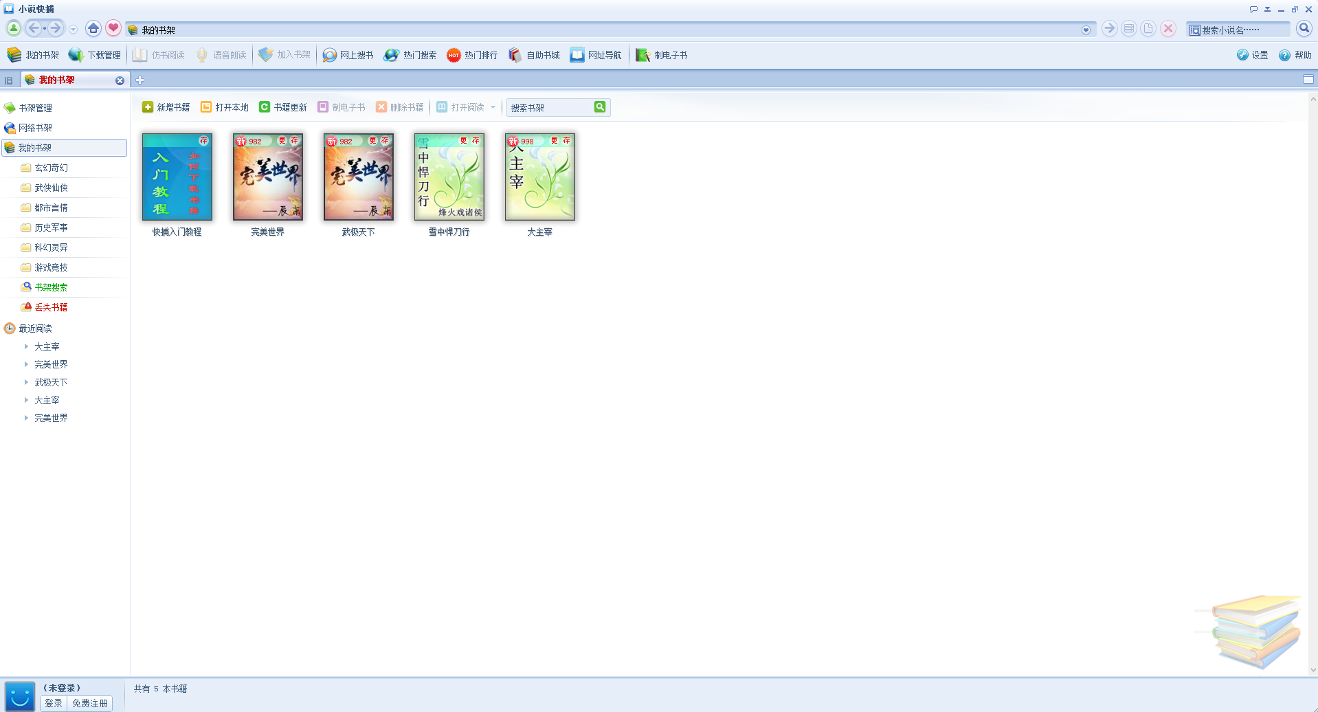 当您打开“本地书籍”时小说快捕默认情况下会启动书籍更新功能来下载您所打开书籍的最近更新章节。当然您也可以通过手工操作来更新指定的书籍或书架中的所有书籍。