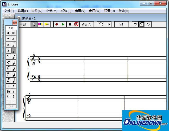 Encore4.5界面最大的特点,就是界面十分简洁,非常朴素,这也是区别于其他几个软件的地方。它的优点是界面简洁明了,没有专业学过打谱软件的人也能一用就会,它可以制作打印钢琴谱、带伴奏器乐声以及交响乐总谱等等一系列常用乐谱,基本上可以满足一般乐谱制作的要求。另外Encore自带音序器,可以通过音源(声卡)来播放乐曲,功能非常实用。Encore虽然看上去比较简单,但是它的功能却一点儿也不少。
