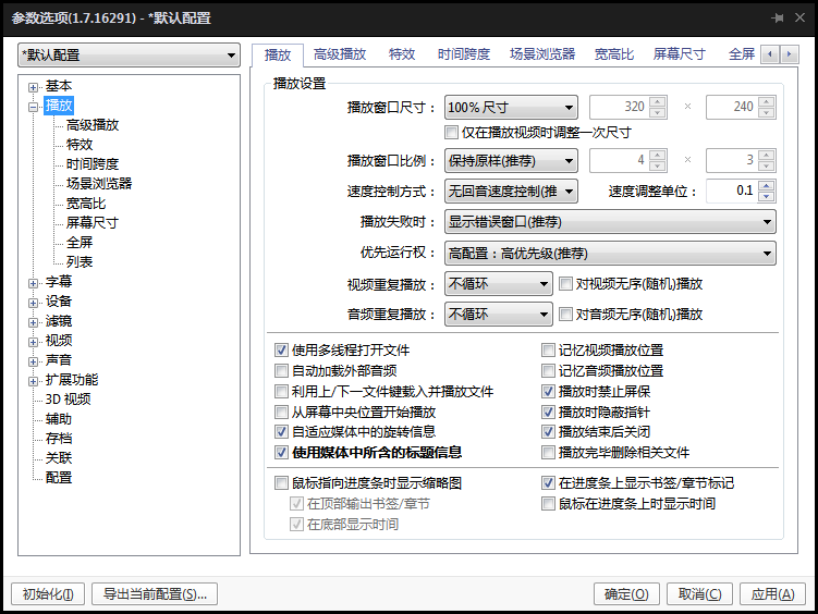 2、在打开的选项窗口中点击左侧的【播放】,在右侧界面中点击【高级播放】中的使用方法设置 “预读下一个文件后播放” 并确定