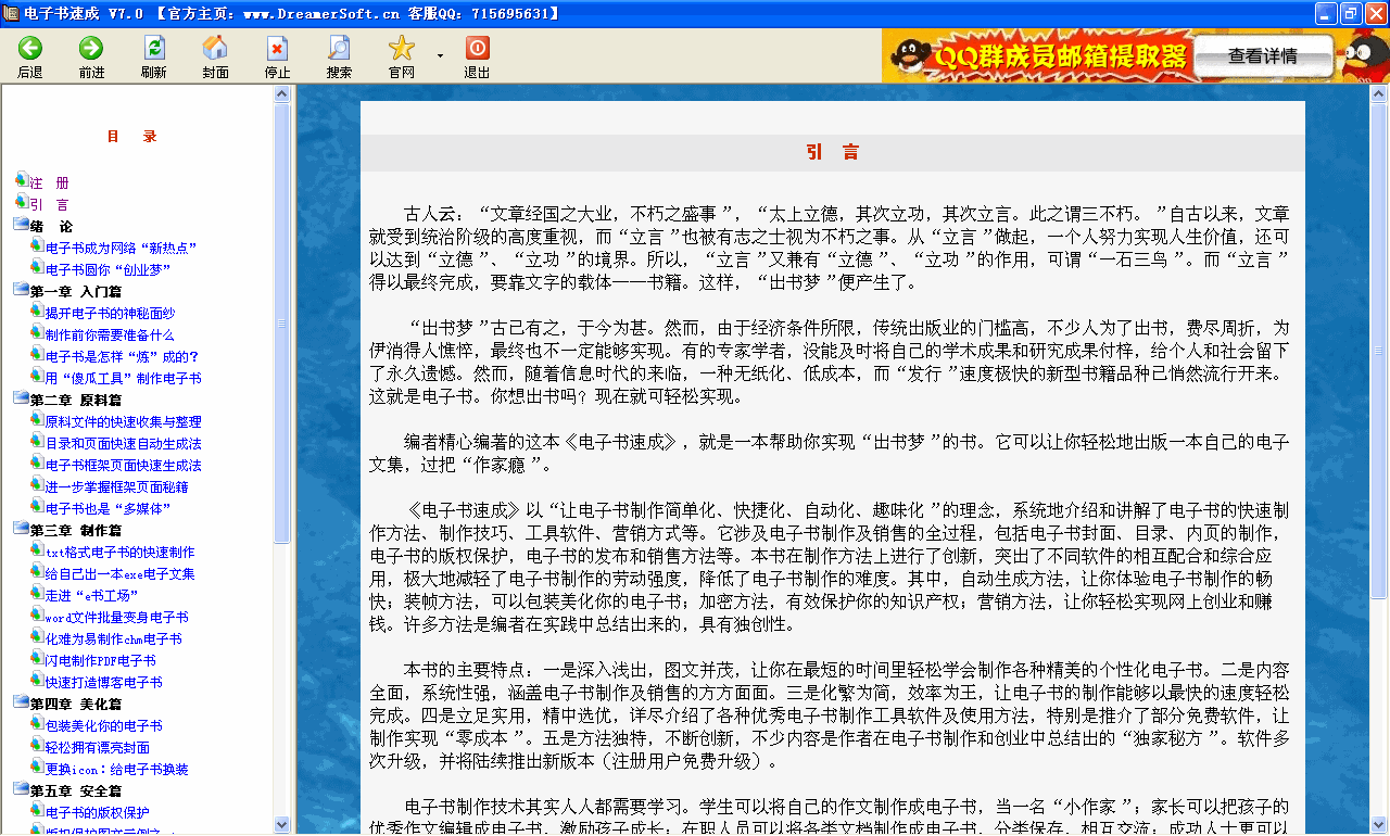 本软件以“让电子书制作简单化、自动化、趣味化”的理念,系统讲解了电子书的快速制作方法及营销技巧,开辟了一条电子书制作和创业的捷径。主要特点有: