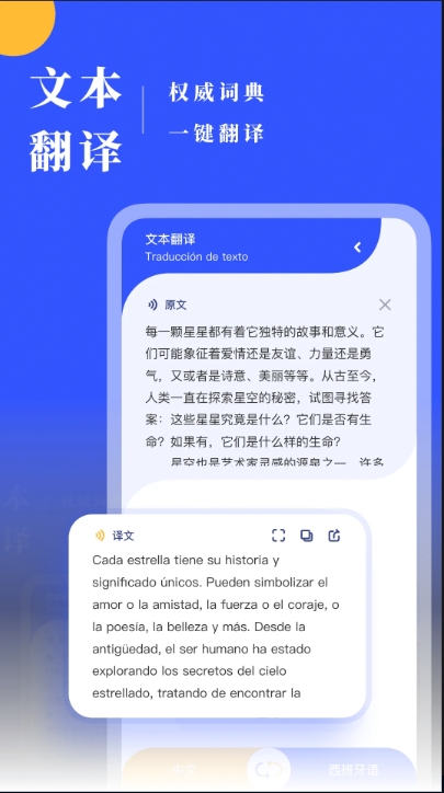 文本翻译:支持西班牙语与中文双向互译,输入文本即可快速获取结果,适合学习、写作等场景。