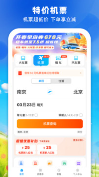 机票特惠:提供全球特价机票,支持往返立减20元,千条打折航线任选,并可在线值机、查询航班动态。