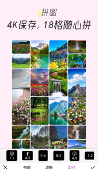 拼图与布局:支持将多达15张的照片进行组合,提供100+布局可供选择。用户可以变换照片组合比例,调节照片组合的边框,并通过拖动交换图片、替换、旋转、裁剪等操作,轻松制作出精美的拼贴画。