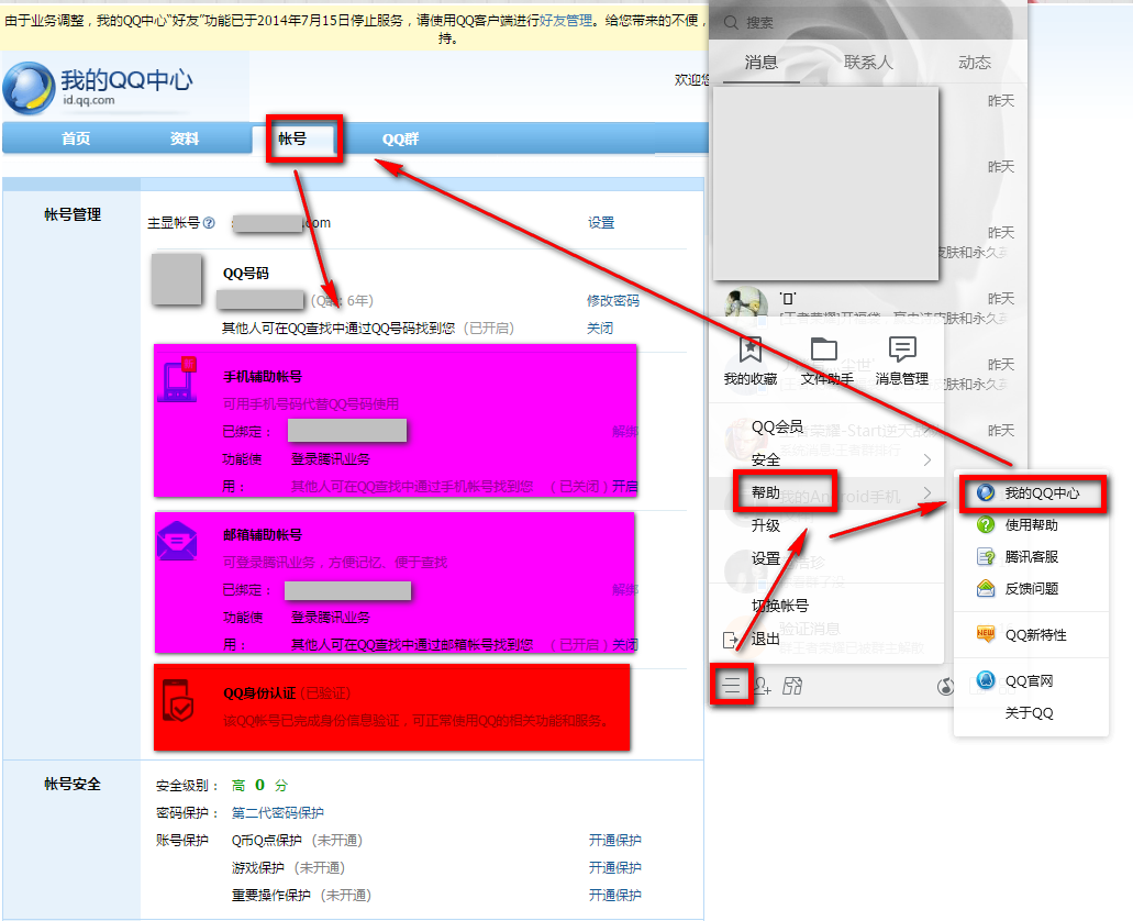 1、首先需要你打开自己腾讯QQ界面,然后根据如下提示找到【主菜单】选择【帮助】选项并单击【我的QQ中心】,进入账号实名认证页面。