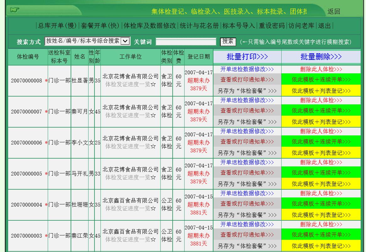 本软件集体检登记、临检录入、医技录入、标本批录、团体批录、Excel批导批录、套餐管理、档案管理、标准管理、收费管理、自动报告、自动评价、分类统计、终端查询、领导查询、进度查询等全部流程于一体,全部流程均以体检编号作为数据共享的唯一代码,天然遵守体检流转过程的“唯一性”。全部流程既可由单机单人完成,也可由多机多人完成,为真正意义上的单机/网络兼容版。本软件能胜任团队大批量医院医技检查、临床检验网络化、流程化、信息化、规范化管理。