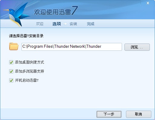 2.选择自定义安装以后,可以选择安装的位置、是否添加迅雷7到桌面快捷方式、开机启动等等。