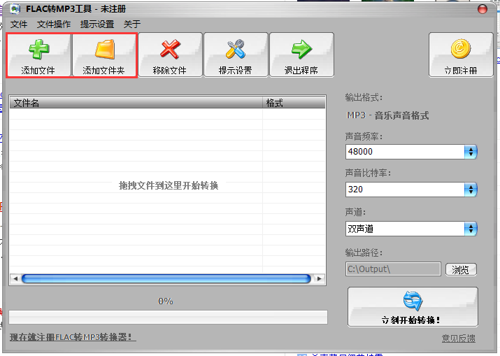 1、打开安装好的FLAC转MP3转换器,点击左上方的“添加文件”或“添加文件夹”,分别可以添加单个文件或整个目录中的文件。