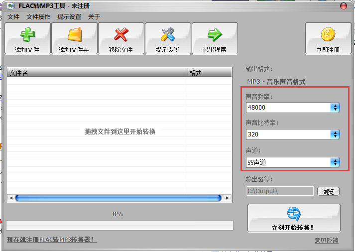 FLAC转MP3转换器支持将FLAC转换成MP3高品质音乐,默认设置高音质48000Hz、Stereo双声道、320Kbps比特率,如果您对MP3的大小有要求,您可以可以自己调节这些设置来获得更好的文件大小。