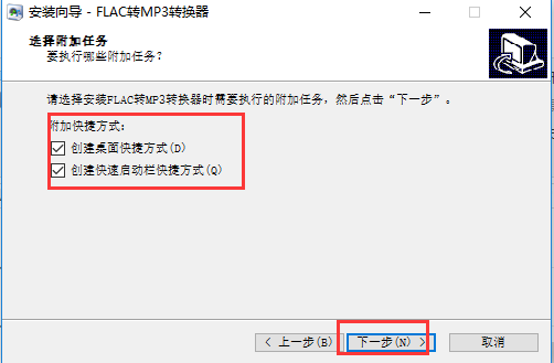 5、选择FLAC转MP3转换器是否需要“创建桌面快捷方式”和“创建快速启动栏快捷方式”,之后点击“下一步”。