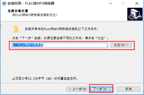 3、点击“浏览”选择FLAC转MP3转换器的安装目录,此处不建议安装在C盘,如果C盘文件过多的话,会影响计算机的运行速度。选定后点击“下一步”。
