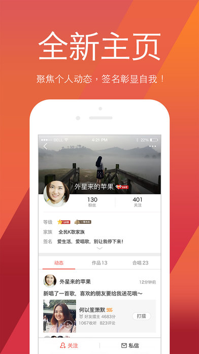 全民k歌让你和我的声音相遇,私信让你我相知,想说的悄悄话就用私信表达出来。