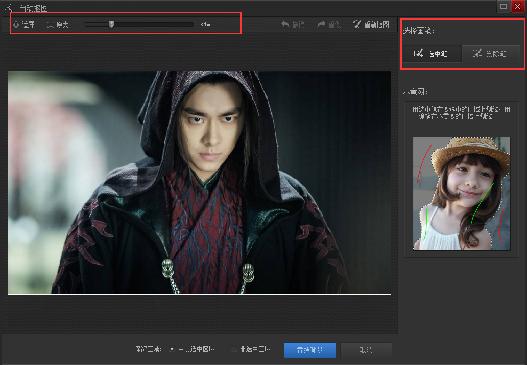 2、光影魔术手软件可以通过放大缩小来调整图片的尺寸,放大图像编辑更容易些。这里我们在右边有【选中笔】与【删除笔】两种画笔可供选择,这里选择【选中笔】然后将画笔移动背景中画上一笔即可,如果背景不能全部涵盖进去的话,再继续涂画没有涵盖的区域即可。其实,如果所要抠取的是一个色彩比较单一的物体的话,直接在该物体上涂画即可。(用选中笔在要选中的区域上划线,用删除避在不需要的区域上划线即可。)