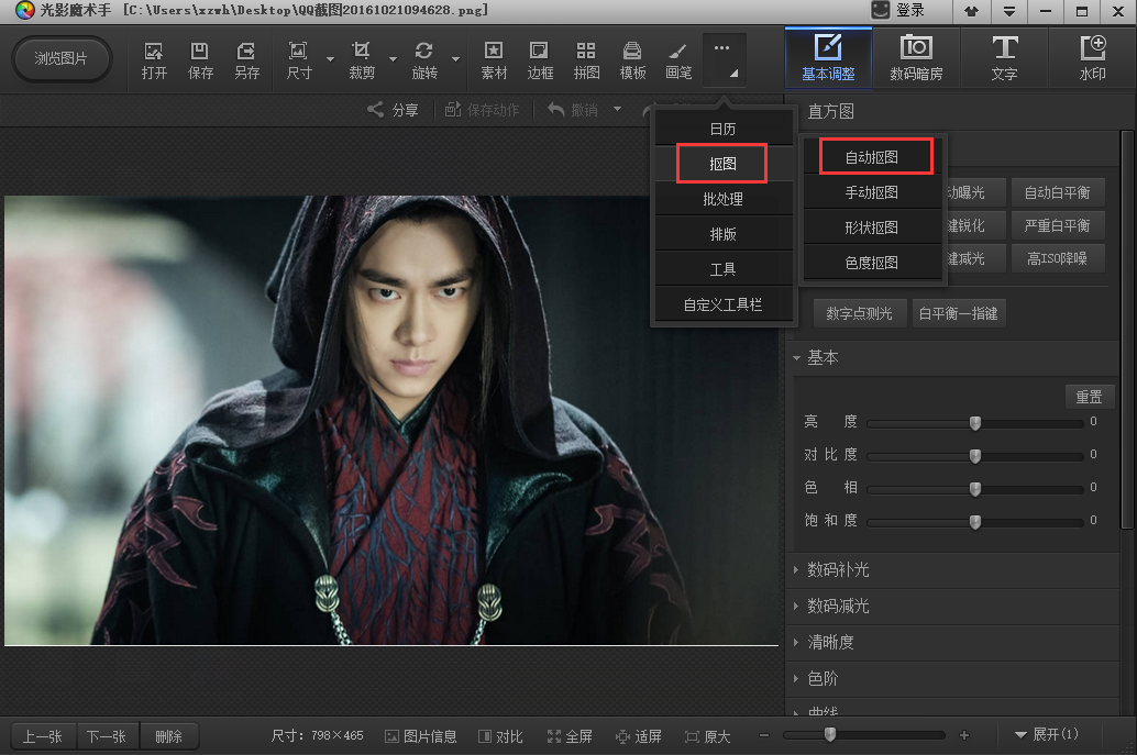 3、打开要编辑的图片会就会看到如下界面,接着我们点击偏右些的(箭头所指)的小工具,单击打开选择【抠图】→【自动抠图】。(抠图有四种模式:自动抠图、手动抠图、形状抠图、色度抠图;如果图片是和背景比较鲜明的话,选择自动抠图这样比较方便)