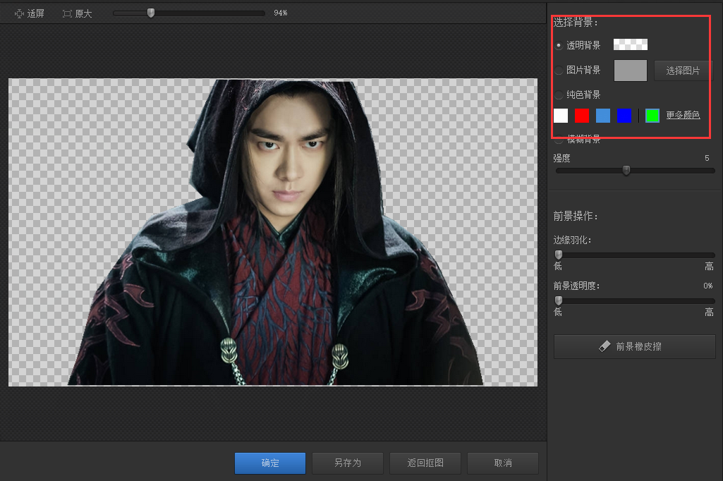 3、用选中笔/删除笔划线完后,可点击替换背景点击查看自己扣的图,如果不满意还可以点击“返回抠图”继续编辑。确认抠图完成可点击在右边的背景色来选择替换,这里有各种颜色可供选择也可以调取电脑存有的图片作为背景。在下方还可以对图像进行简单的前景操作,如边缘羽化、前景透明度等。