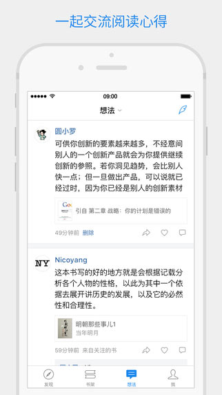 5、打开想法一栏,可自由发表自己的想法,也可浏览朋友们的想法和阅读过的书籍和体会。