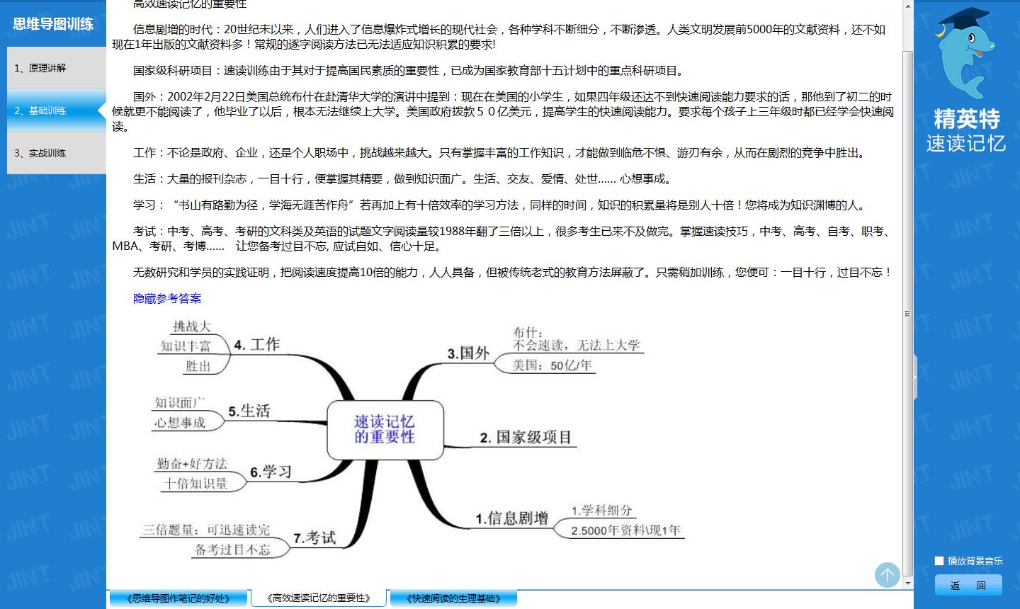 精英特速读记忆训练基于充分开发协调左右脑的快速阅读记忆原理,是当今最成熟的速读记忆训练模式。具体如下: