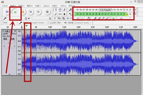 3、点击Audacity菜单栏的播放按钮进行音乐试听,确定好要剪辑的音频时间范围