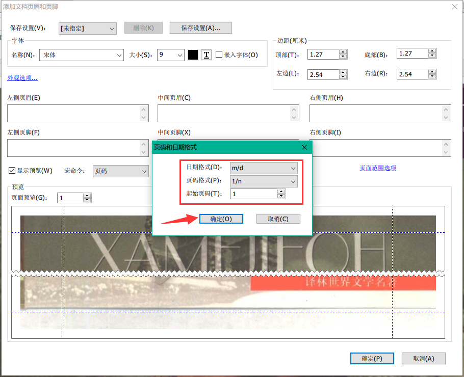 3、在“页码和日期格式”弹窗里选择好页码格式和起始页码,然后点击确定。