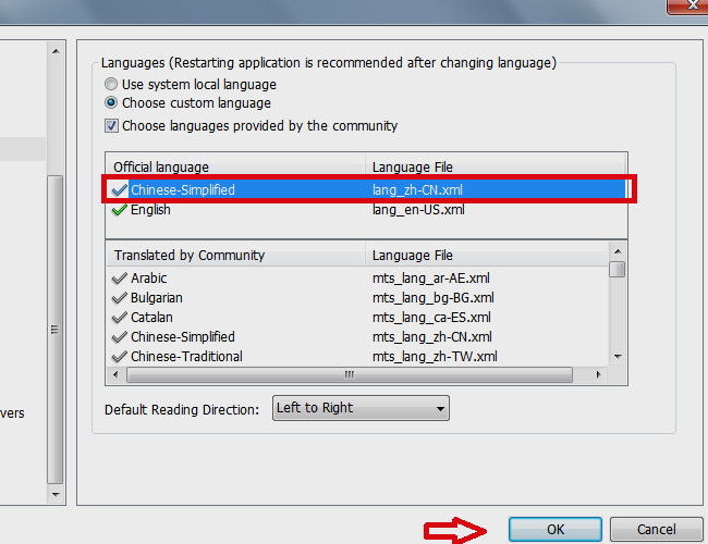 4、然后在出现的页面中选中“简体中文”选项,点击“ok(确定)”按钮。