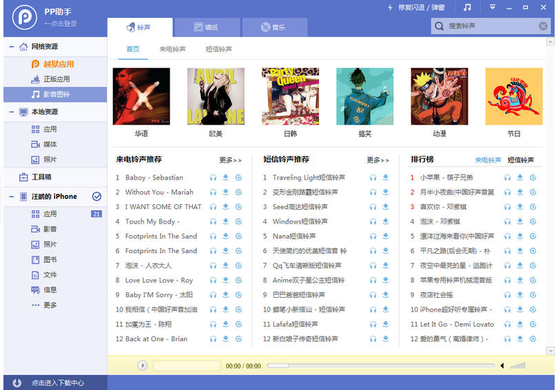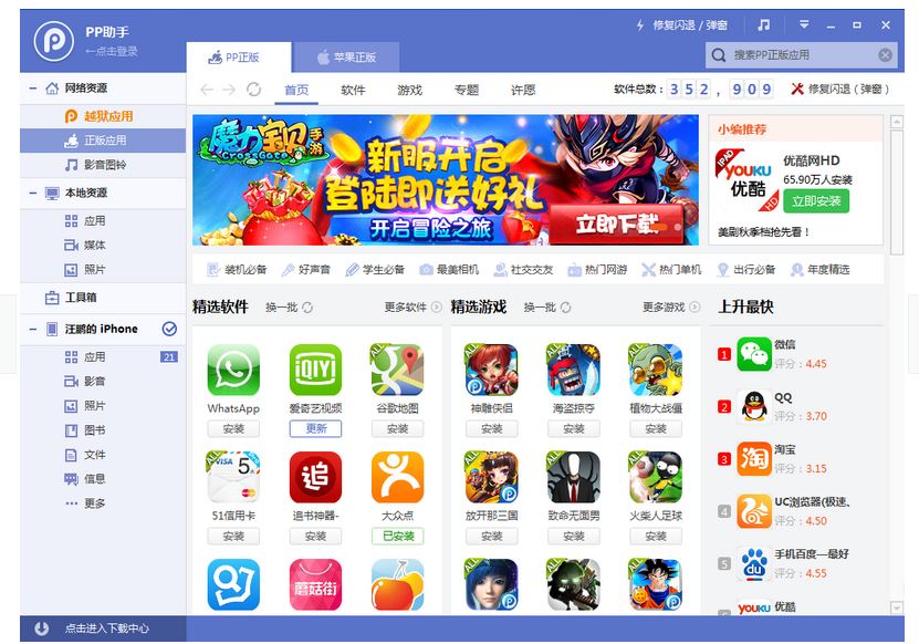 遵循用户需求,坚持每日更新大量资源,PP助手安卓版涵盖最新最全的应用,最热最火的游戏,以及流行搞笑铃声,精美个性壁纸等等,为国内数以亿计的安卓用户提供一站式免费获取安卓资源的服务。