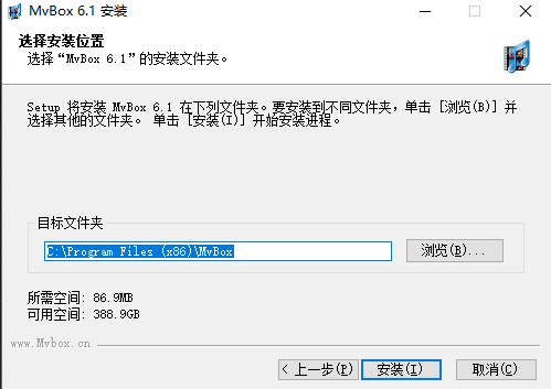 4、使用鼠标左键单击“浏览”来选择MvBox的安装目录,此处不建议安装在C盘,如果C盘中的文件过多的话,会影响到计算机的运行速度。设置完成后,点击“安装”按钮开始安装。