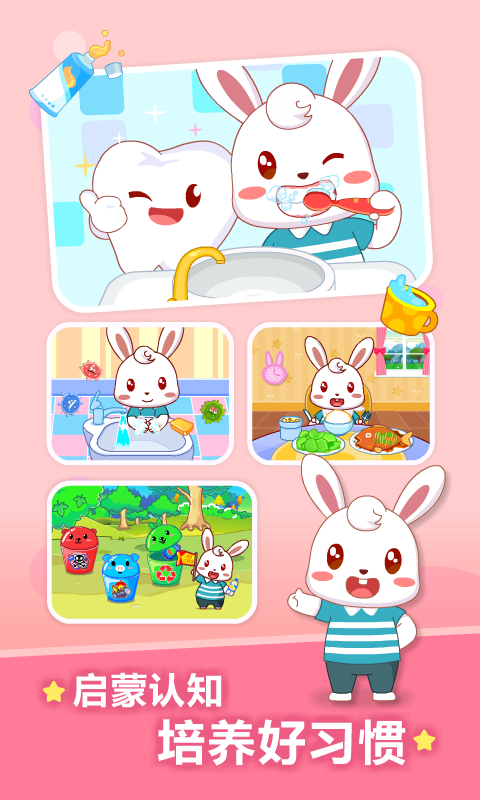 以可爱小兔子为形象,将海量儿歌、故事、古诗融入于生动有趣的原创动画中,并同时置入有一定的启蒙益智场景,是千万家长使用后一致推崇的手机必备应用。