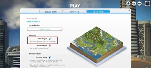 1、启动游戏,选择新建游戏。建立城市后,选择完地图后,需要给地图进行命名。随自己喜好取一个名字,在地图名字下面有私人区域和沙盒模式两个选项,点击沙盒模式就是单人模式。如下图的红圈内的位置。
