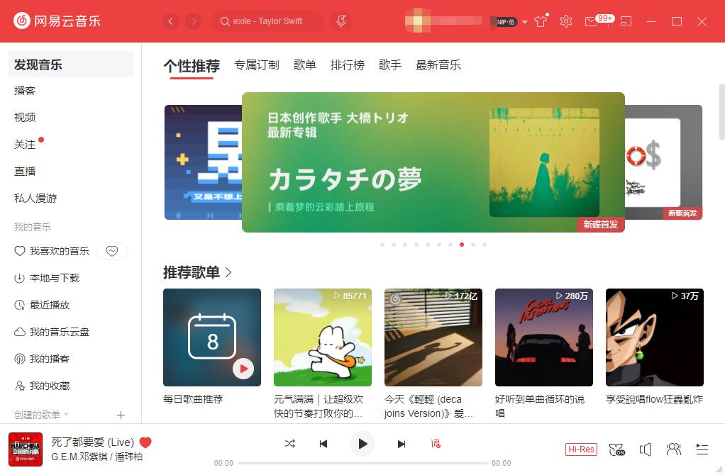 2、登录完成后,您可点击软件顶部的分类选项,个性推荐,歌单,主播电台,排行榜,歌手等选项,来查找自己喜欢的歌曲,或者您可以在网易云音乐电脑版的搜索框中输入自己想要听的歌曲。
