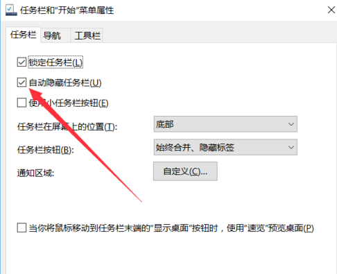 6、右键点击击任务栏,打开任务栏后勾选【自动隐藏任务栏】