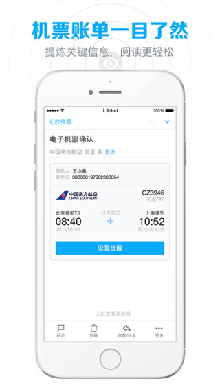 - 机票、酒店和账单邮件卡片式设计,重要信息一目了然。