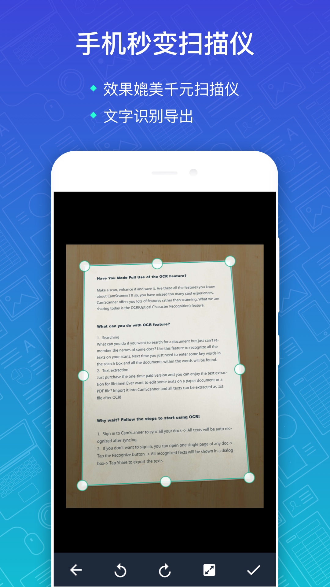 扫描大师是智能文档表格扫描OCR识别工具,实时获取高清电子稿扫描件,并可编辑图片内文字或导出为TXT文本再次编辑,智能识别表格内文字,即时编辑修改表格内文字,分享到微信、QQ、邮件等多种工具。