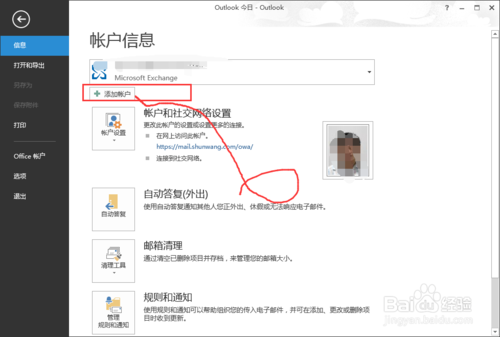 1、在Outlook2013添加邮箱账户,首先打开我们的outlook邮箱工具,接着点击左上方的“文件”菜单中的“信息”选项就会来到帐户信息界面,如下图所示: