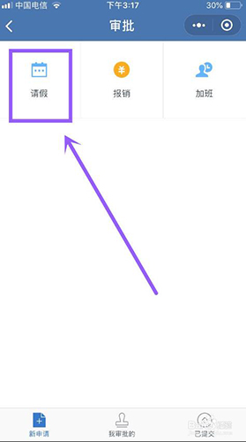 2、然后在审批的页面中,将会看到三种申请,分别是:请假、报销、加班。点击【请假】。