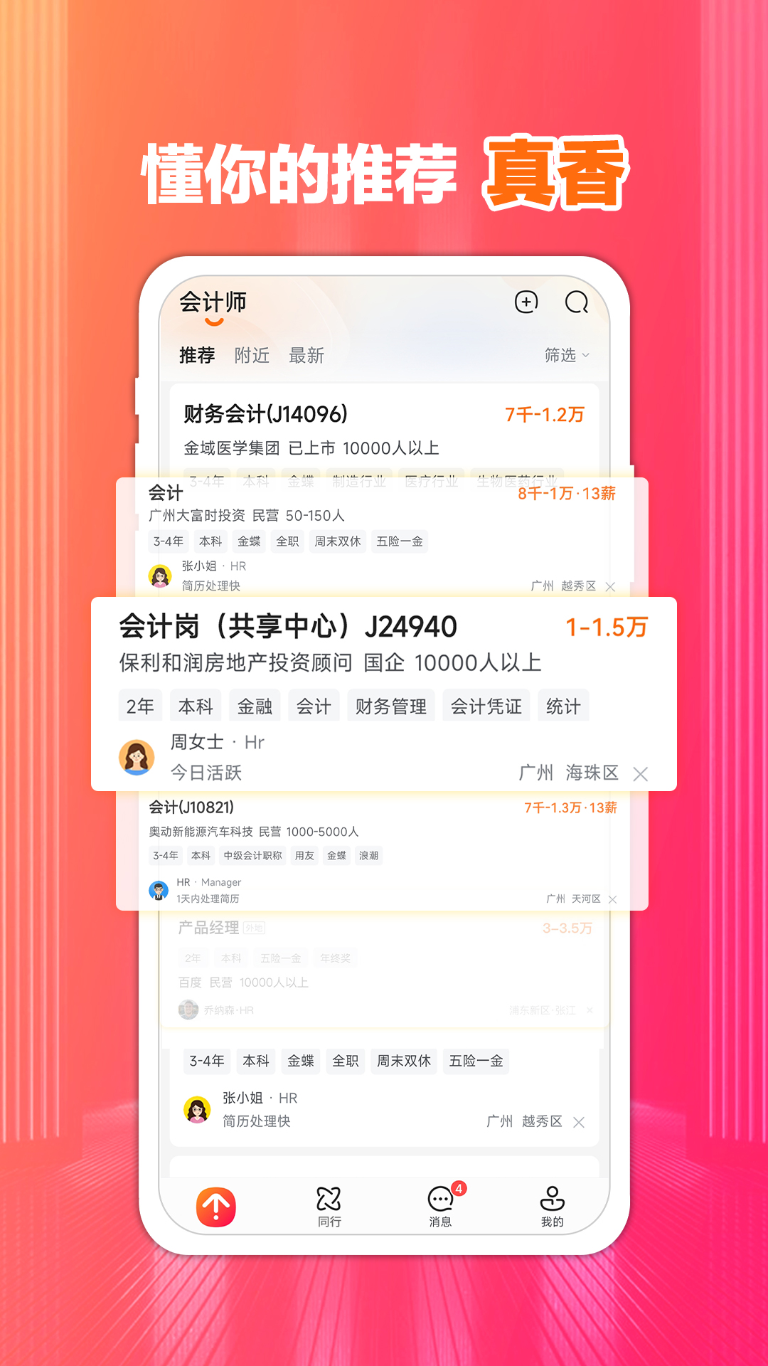 BOSS直聘app是一款非常实用、功能更加全面的网上求职招聘软件。用户可以在这里进行更好的简历投递、更加精准的为你匹配岗位信息、用户可以随时随地查看简历进度、在线了解更多求职资讯非常方便。