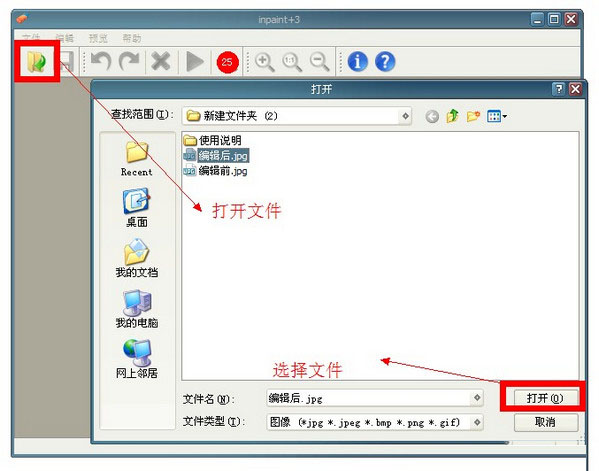 1、打开在本站下载好的Inpaint图片去水印工具,打开软件后点击左上角的文件,在弹出的选项中点击打开,找打你要处理的图片