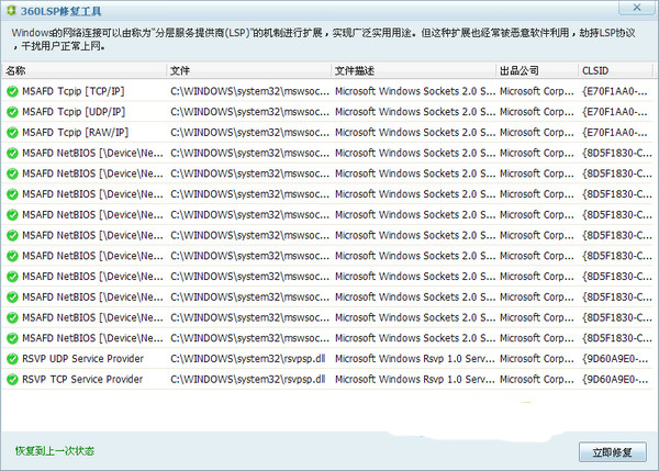 1楼 华军网友 2022-01-25 06:13:45360lsp修复工具很好用,谢谢啦!!