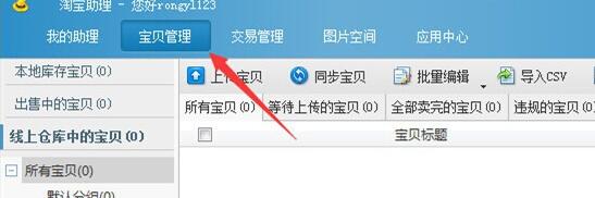 1、登录淘宝助手后,进入宝贝管理