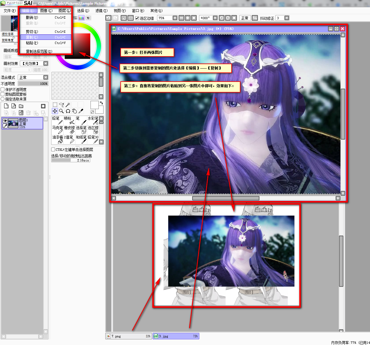sai怎么把一张画画放到另一张画里?