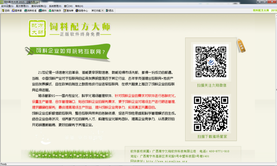 《饲料配方大师V2015》简称《配方大师2015》是基于动物营养学、运筹学、计算机软件工程学及大型数据库理论的全方位多功能计算机软件系统,主要完成最新原料成份数据、营养标准数据的发布与自动更新、配方的手工或自动制作、配方交换文件的制作与更新、配方通知单据的管理等功能。《配方大师2015》可以通过网络或其他媒体为企业提供最新版本的各类数据并能自动对系统进行更新升级,免去手工修改的麻烦,使用户能够方便地更新各类技术数据,提高配方管理体系的科技含量。配方制作是本软件的核心部分,本软件自动计算最优营养配方,或在允许的误差范围内计算最低的成本,并同时允许操作员对原料配比进行手工修改。