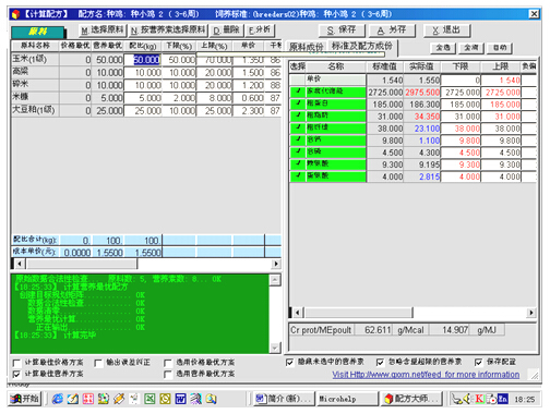 g) 高速度:对于由10种原料混合,考虑10种营养素的配方,最佳营养方案计算所需时间低于0.3秒,最佳价格方案计算所需时间低于0.5秒,因此可以在线观察配方各营养成份与配比的变化情况。(在C600/128M,Windows2000的机器上测试