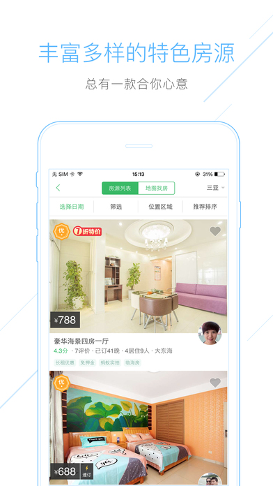 “临海房”、“主题公园房”、“周边游房”、“毕业旅行房”等各种专题房源,通过专题入口能轻松地选到满意的独栋别墅、酒店式公寓、民宿、客栈、四合院、木屋、树屋、房车、帐篷等;