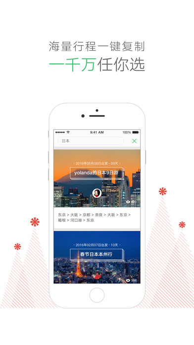 覆盖境内外200多个国家、10000多座城市的几百万条境外行程供你自由搜索和复制。懒和忙都不是事儿,旅行就要说走就走!